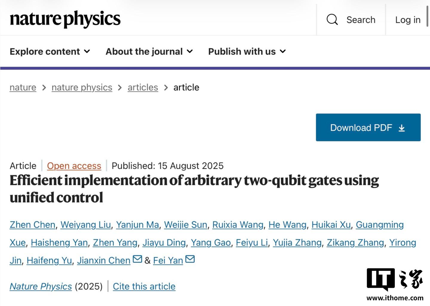IT之家查询发现,相关研究成果已于 8 月 15 日以“基于统一控制方案的任意两比特门的高效实现”为题发表在《自然 物理》上。